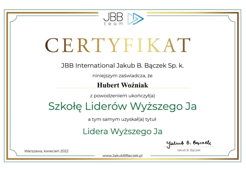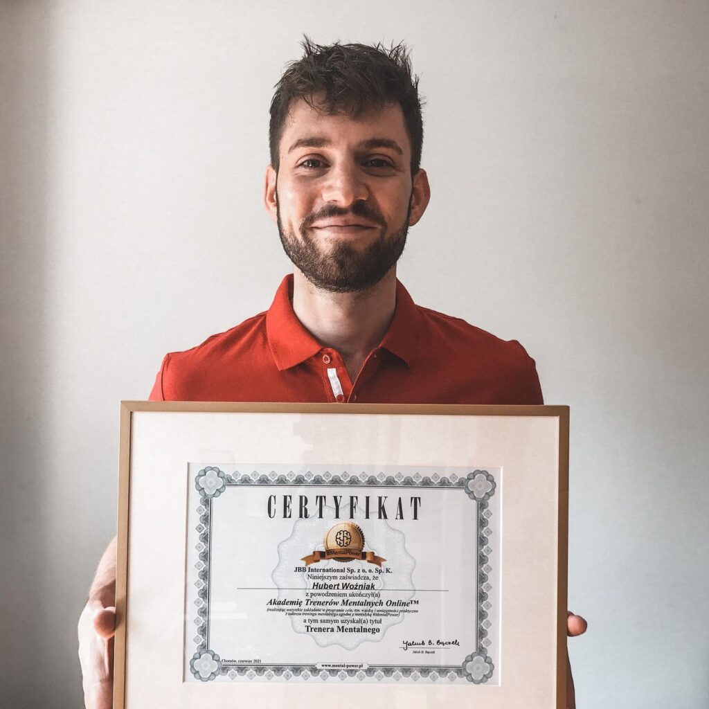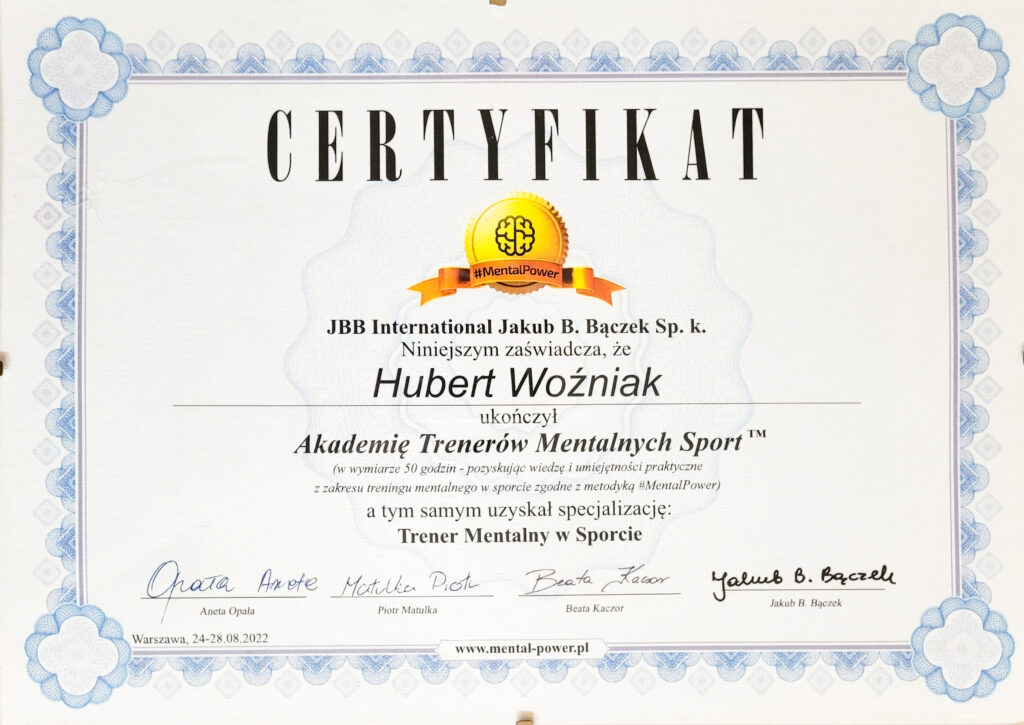 Psychologia i sport jako dwie największe pasje zaowocowały ukończeniem przeze mnie Akademii Trenerów Mentalnych oraz Akademii Trenerów Mentalnych Sport, autorstwa Jakuba B. Bączka. Trenera mentalnego, który zdobył mistrzostwo świata z kadrą narodową siatkarzy w 2014 roku, a obecnie współpracuje z topowymi sportowcami i przedsiębiorcami.